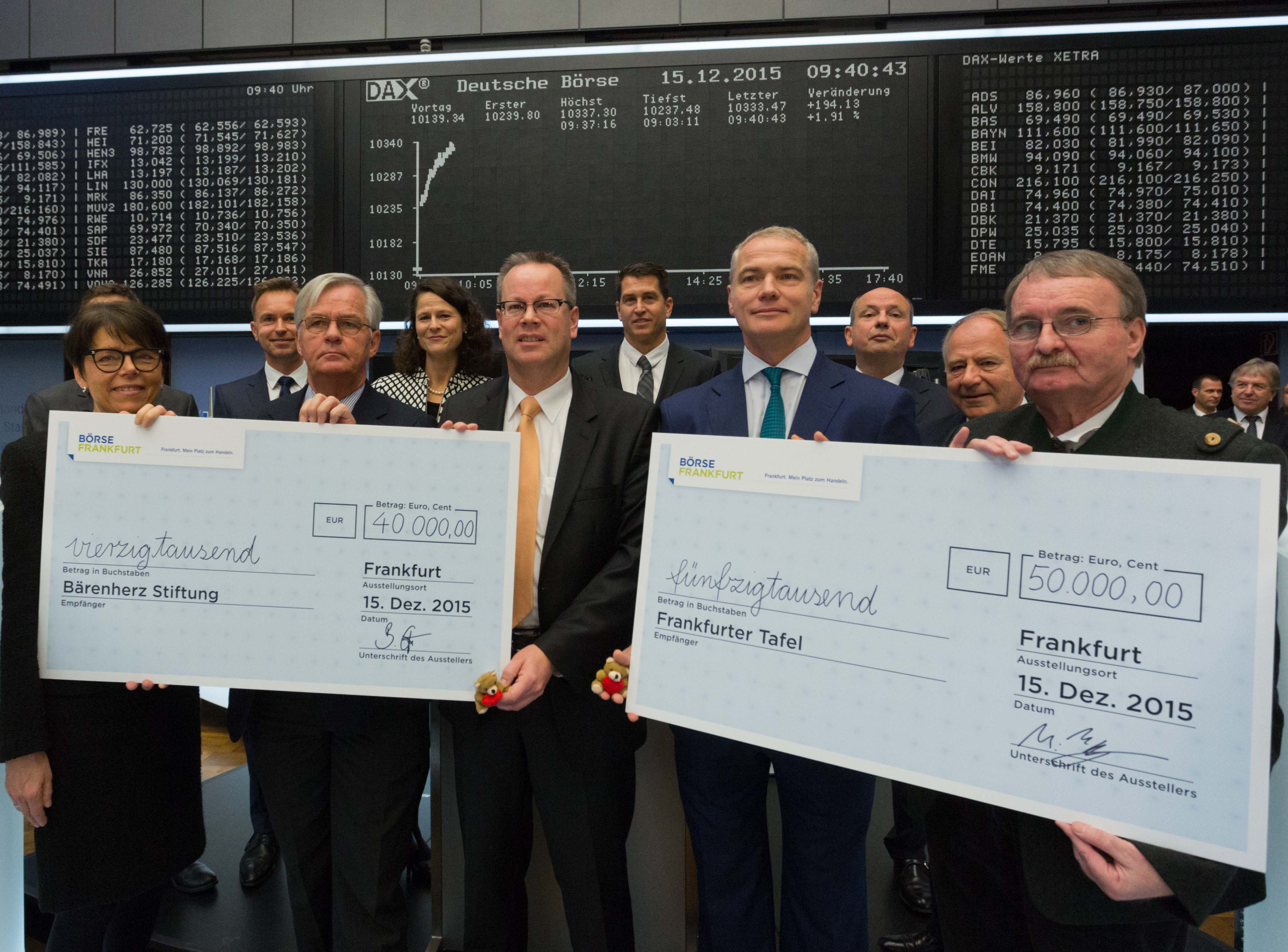 Die Deutsche Börse AG, vertreten durch CEO Carsten Kengeter, und die auf dem Frankfurter Parkett tätigen Spezialisten haben heute im Frankfurter Börsensaal die Höhe der Spendenerlöse der Aktion „Handeln und Helfen“ an zwei gemeinnützige Einrichtungen bekanntgegeben. Insgesamt sind durch die Aktion 90.000 Euro zusammengekommen. Davon spendete die Deutsche Börse 50.000 Euro an die Frankfurter Tafel und die Spezialisten 40.000 Euro an die Bärenherz Stiftung.