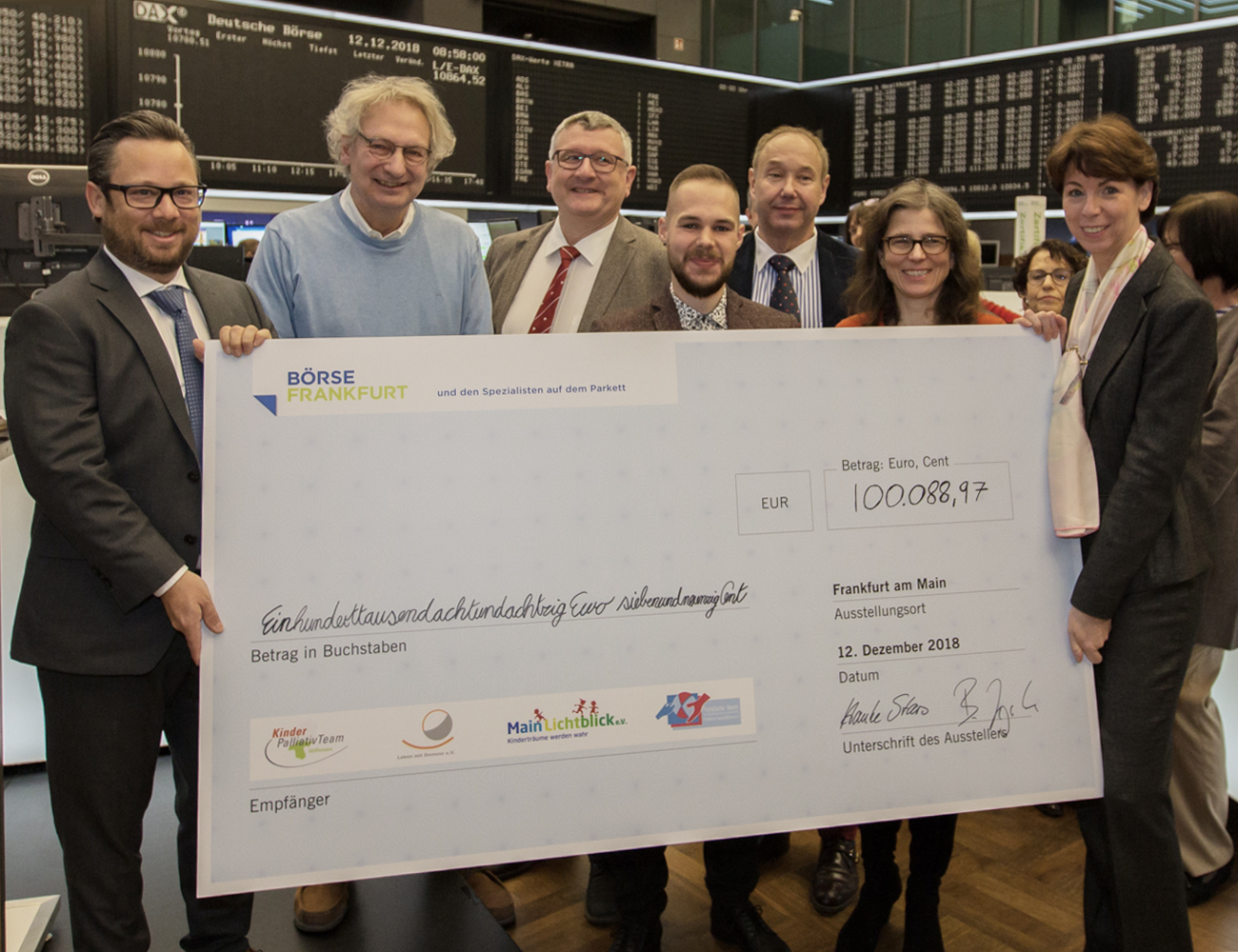 Davon spenden die Spezialisten 41.085,69 Euro an den Frankfurter Verein zur Unterstützung psychisch kranker Kinder & Jugendlicher e.V. und an MainLichtblick e.V. Die Deutsche Börse spendet 59.003,28 Euro an das KinderPalliativTeam Südhessen und den Verein Leben mit Demenz e.V. Die Vertreter der Organisationen durften im Anschluss an die Übergabe den Handel an der Börse Frankfurt mit der traditionellen Börsenglocke eröffnen.