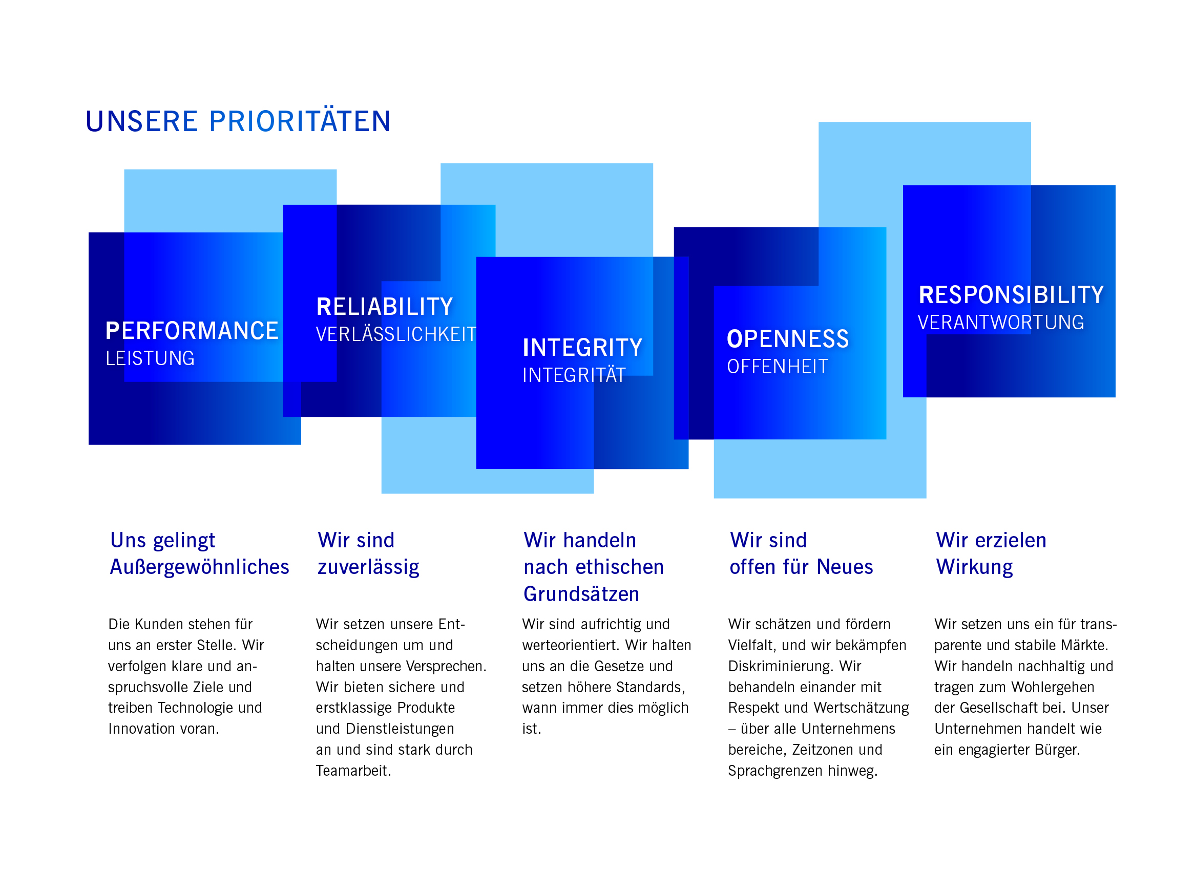 Unsere PRIORitäten – Performance, Reliability, Integrity, Openness und Responsibility – bilden das Fundament unserer Kultur und sind der Motor für unseren Erfolg in der gesamten Deutsche Börse Group. Sie werden durch die Werte unserer einzelnen Unternehmenseinheiten verstärkt, die auf deren Geschäftsschwerpunkte zugeschnitten sind, aber auf einem gemeinsamen Verständnis beruhen, dass wir gruppenweit zusammenarbeiten, um unser Ziel zu erreichen: Vertrauen in die Märkte von heute und morgen zu schaffen.