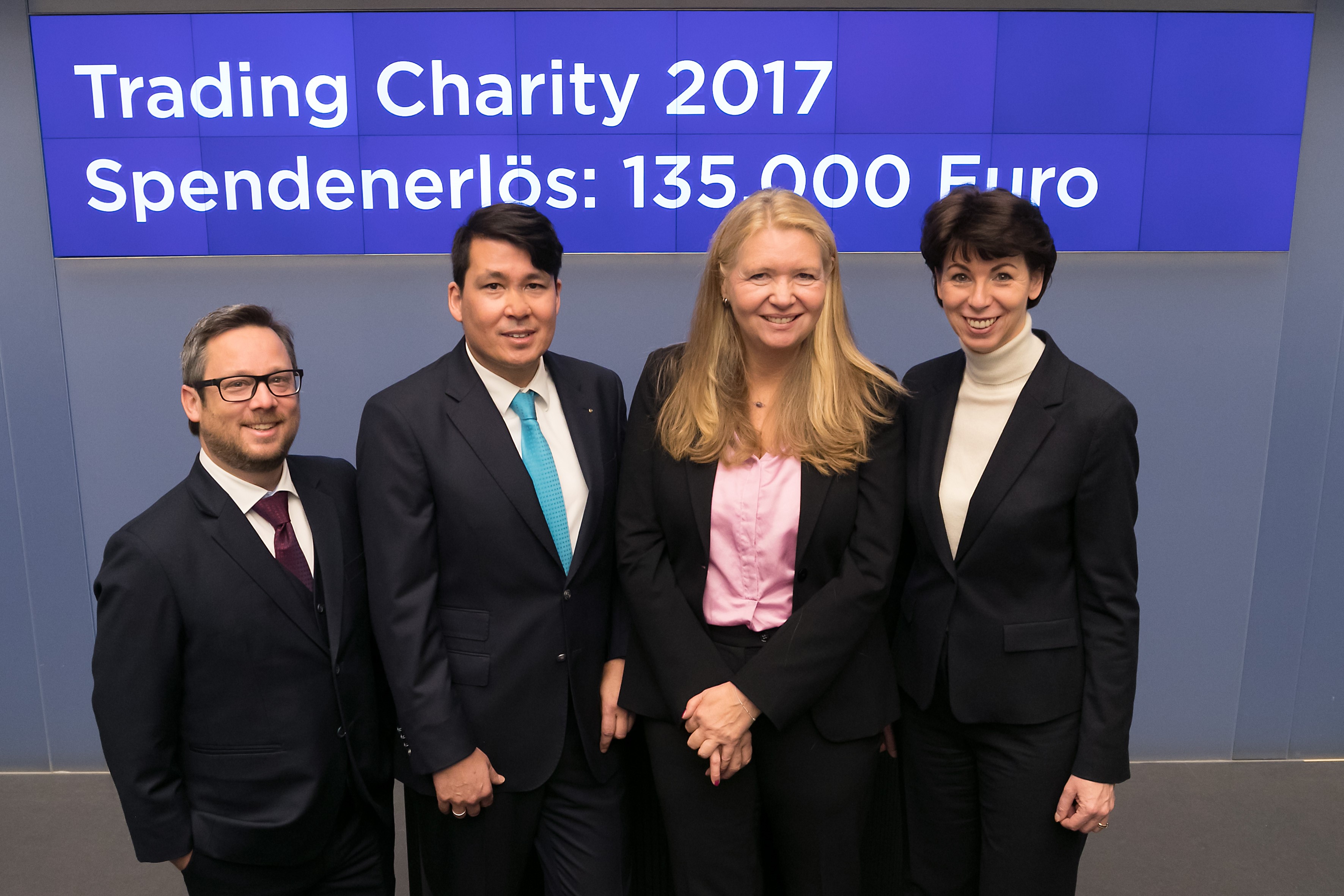 The trading floor specialists opted to donate their trading fees to the “Frankfurter Förderverein zur Bekämpfung von Tumorerkrankungen”, which aids treatment and support of the region's cancer patients. Deutsche Börse decided to donate to “Hilfe für krebskranke Kinder Frankfurt e.V.”, which works to improve the conditions of young patients and their families in inpatient and outpatient areas of the children's cancer clinic.