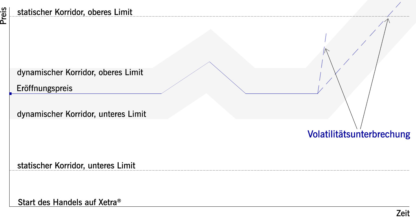 Doch wann wird eine Volatilitätsunterbrechung ausgelöst? Jedes Wertpapier im Xetra-Handel verfügt über zwei individuelle Preiskorridore, einen statischen und einen dynamischen Korridor. Diese Korridore entwickeln sich während des fortlaufenden Handels mit dem Preis des Wertpapiers  . Der statische Korridor wird bei Handelsbeginn um den Eröffnungspreis gelegt und ist relativ weit. Der dynamische Korridor ist enger und legt sich um den letzten entstandenen Preis. Wird bei einer nächsten Preisfeststellung einer dieser Korridore überschritten, wird die Volatilitätsunterbrechung ausgelöst. Vom fortlaufenden Handel wird dann in die mindestens zweiminütige Auktion gewechselt, die einen zufälligen Endzeitpunkt hat, um Preismanipulationen zu verhindern. Der konkrete Ablauf dieser Auktion wird durch das zum Einsatz kommende Volatilitätsunterbrechungsmodell bestimmt, wobei hier zwischen dem Modell der einfachen Volatilitätsunterbrechung und dem der Volatilitätsunterbrechung mit automatisierter Korridorerweiterung unterschieden wird.