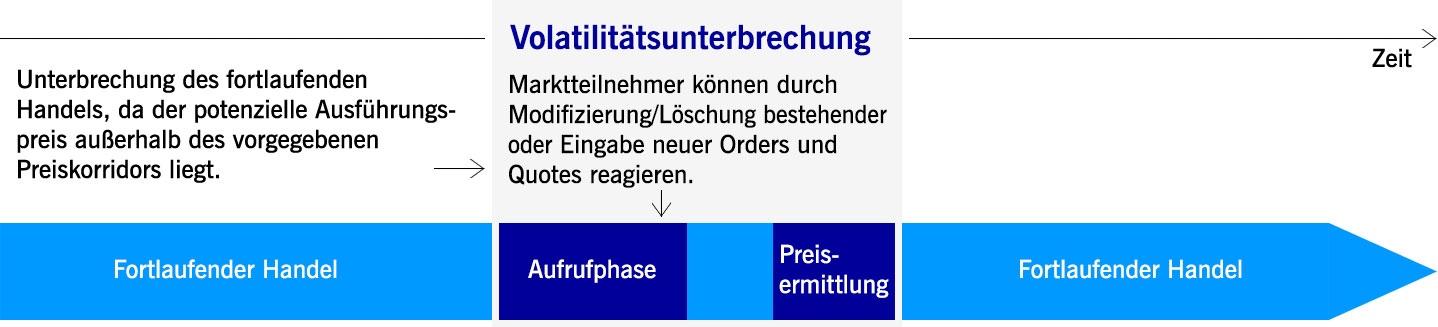 • Bei sehr großen Preissprüngen erhält die Marktsteuerung der Deutschen Börse ebenfalls die Möglichkeit, die Situation zu prüfen – zum Beispiel das Orderbuch, die Nachrichtenlage oder die Ursachen für die Unterbrechung.