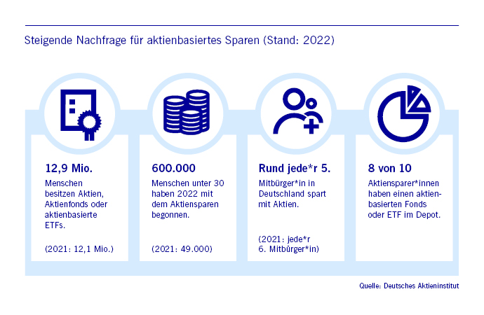 Nur jeder 5. Deutsche investiert in Aktien (Quelle: Deutsches Aktieninstitut).. So liegen in Deutschland Milliarden von Euro auf Tagesgeldkonten, auf denen das Vermögen aufgrund niedriger Rendite sogar kleiner wird. Es ist aber auch ein Trend zu erkennen, wonach die Zahl der Aktiensparer in Deutschland steigt – und zwar so stark wie nie zuvor.