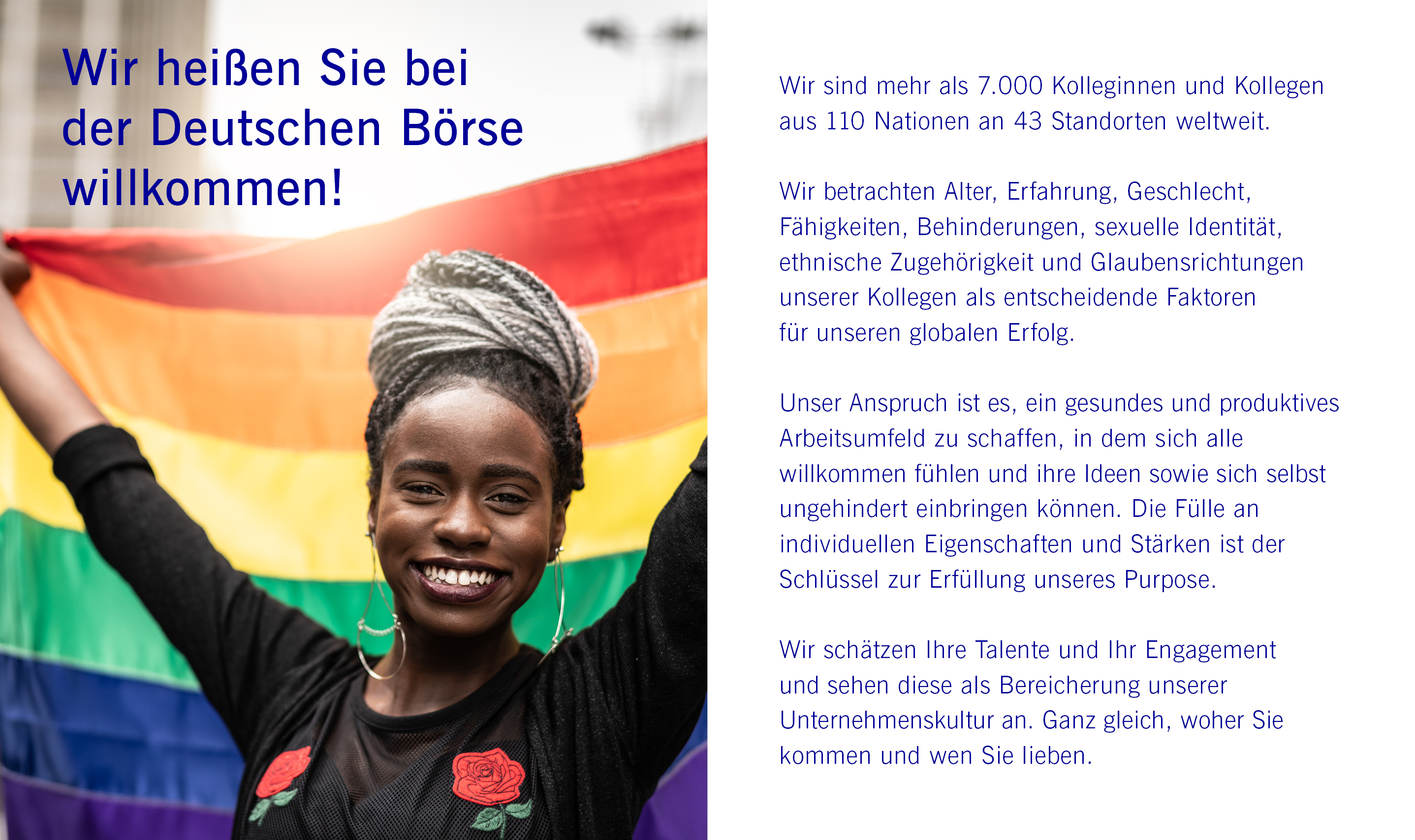 Die Gruppe Deutsche Börse ist weltweit tätig. Wir sind stolz darauf, über 6.000 Kollegen mit einem Reichtum an kulturellen Hintergründen an 41 Standorten rund um den Globus zu beschäftigen. Unsere Vielfalt spiegelt sich jedoch nicht nur in der Herkunft unserer Kollegen wider, sondern auch in der Vielfalt ihrer beruflichen Hintergründe und vielen anderen Unterschieden, die jede einzelne Persönlichkeit unseres vielfältigen Teams kennzeichnen.