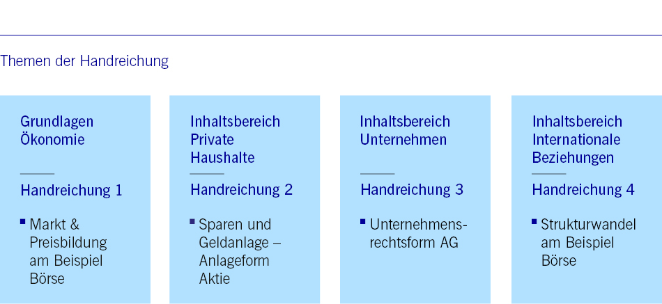 Gemeinsam mit dem Institut für Ökonomische Bildung hat die Deutsche Börse AG Unterrichtsmaterial zum Thema „Wirtschaftswissen“ für den Wirtschaftsunterricht in der Sekundarstufe I entwickelt. Das Material umfasst vier Handreichungen zu folgenden zentralen Themen der ökonomischen Bildung: