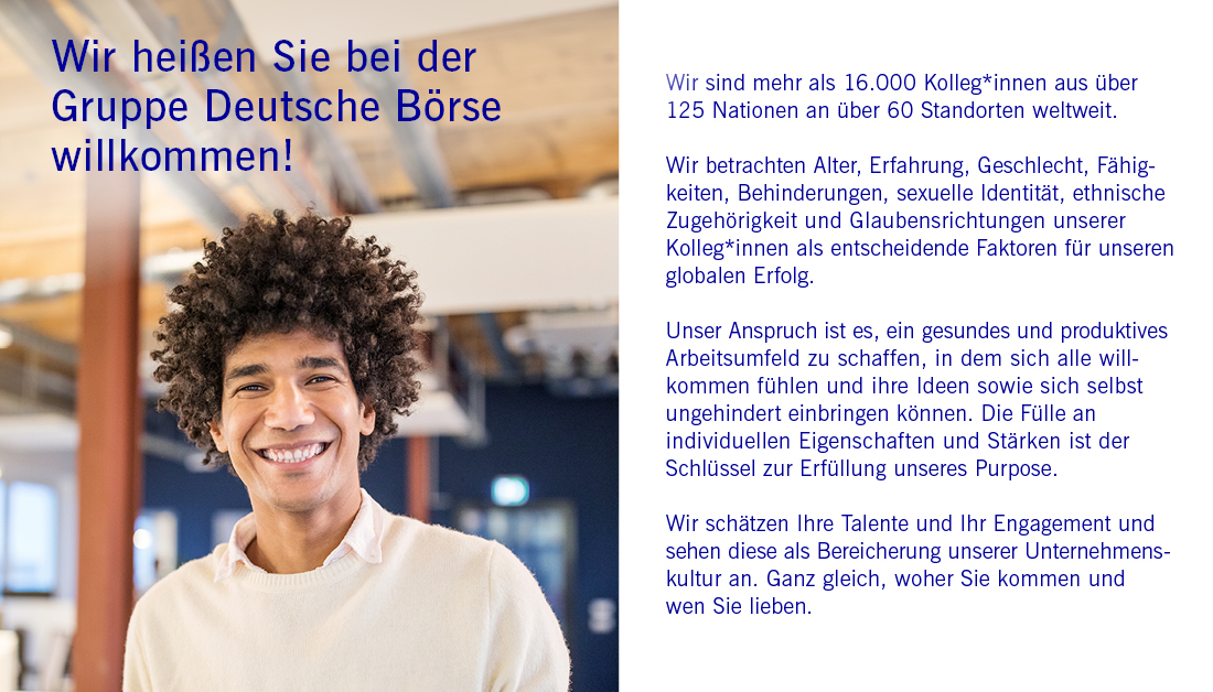 Die Deutsche Börse Group ist ein globales Unternehmen. An über 60 Standorten rund um die Welt beschäftigen wir über 16.000 Mitarbeitende mit den unterschiedlichsten kulturellen Hintergründen. Unsere Vielfalt spiegelt sich aber nicht nur in der Herkunft unserer Kolleg*innen wider, sondern auch in der Vielfalt ihrer beruflichen Expertise und vielen weiteren Unterschieden, die jede einzelne Persönlichkeit, die Teil unseres Teams ist, auszeichnen.