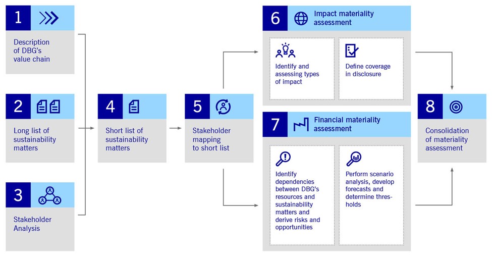 Next, DBG draws up a long list of sustainability matters considering ESRS sustainability matters as well as possible DBG-specific sustainability matters. To ensure a comprehensive long list further resources e.g., previous materiality assessments are considered.